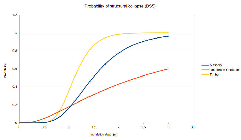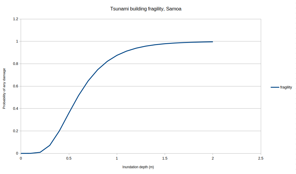 1) or false (i.e.0) result.Fragility functions: these determine the likelihood that a given building was damaged. These functions return a probability between zero and one. For example, at a tsunami depth of 0.5m the probability of any building damage might be 0.36, meaning that on average 36% of buildings would sustain some damage if exposed to that tsunami depth.